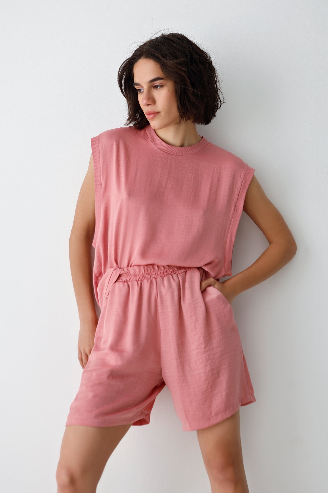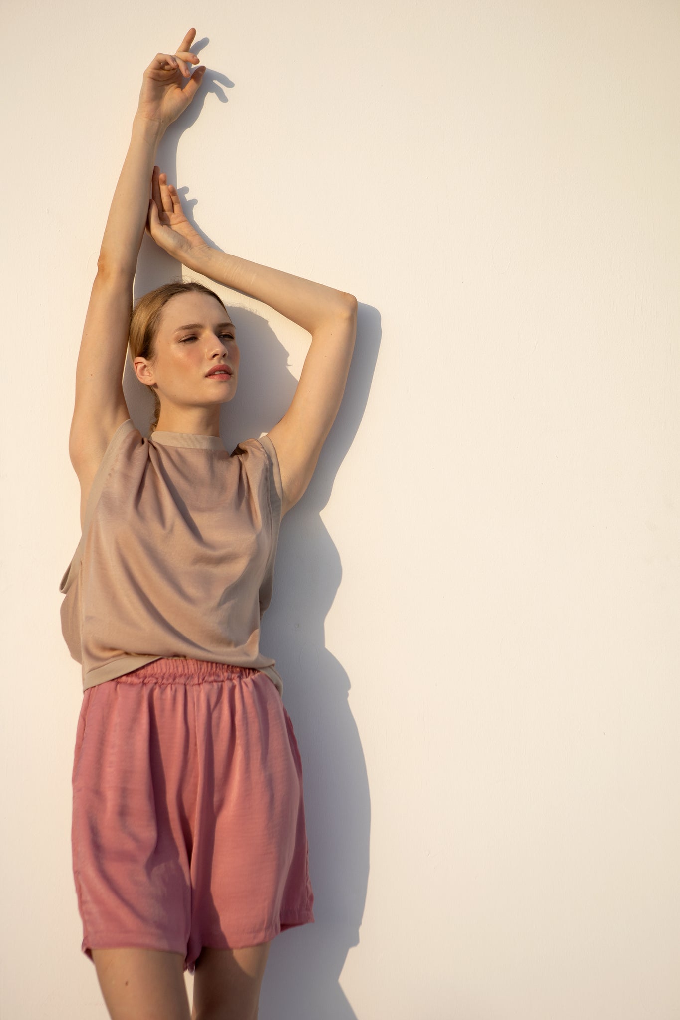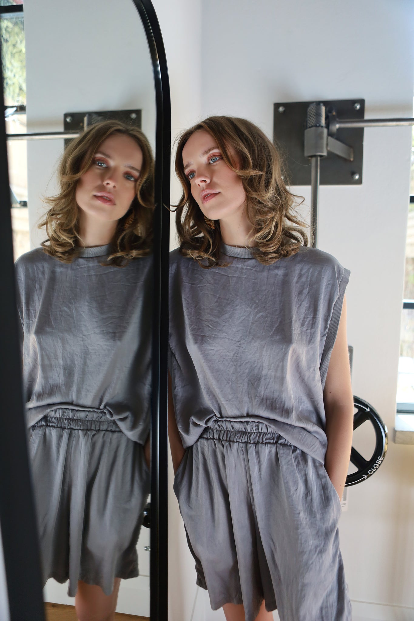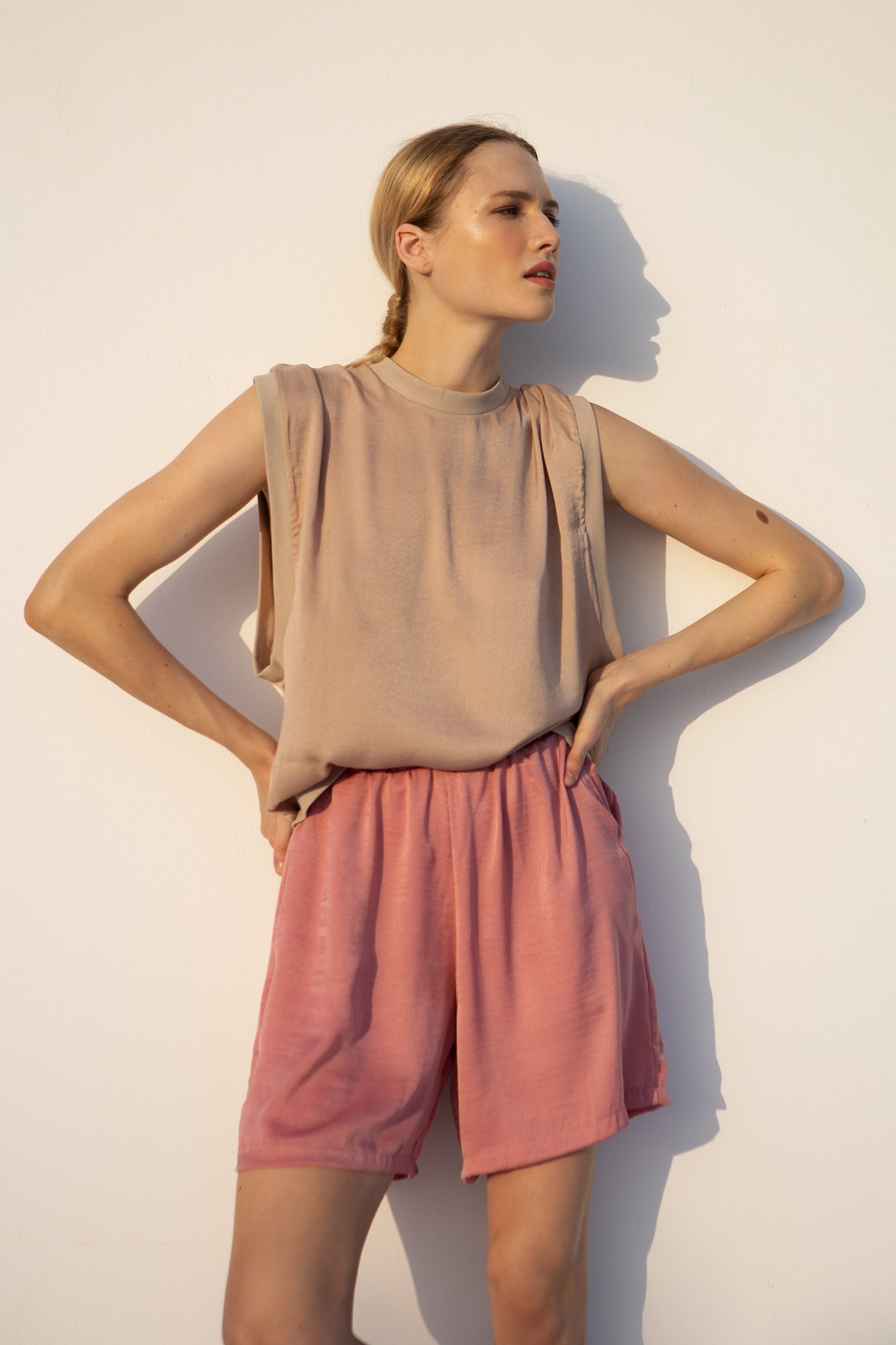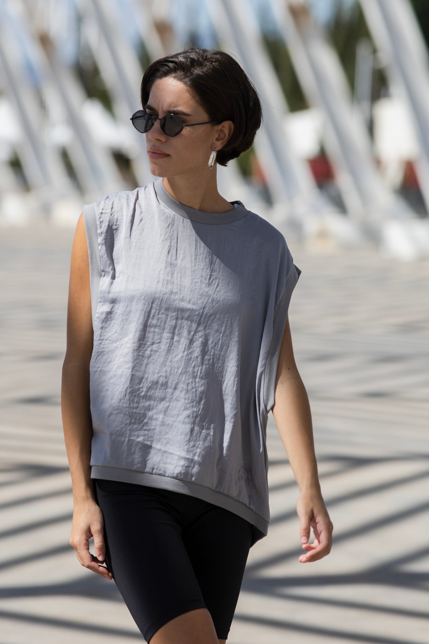 Αμάνικη σατέν μπλούζα, με ασύμμετρο μήκος, μεγάλα ανοίγματα στις μασχάλες και rib πλέξη στα κοψίματα. Φαρδιά και άνετη εφαρμογή!