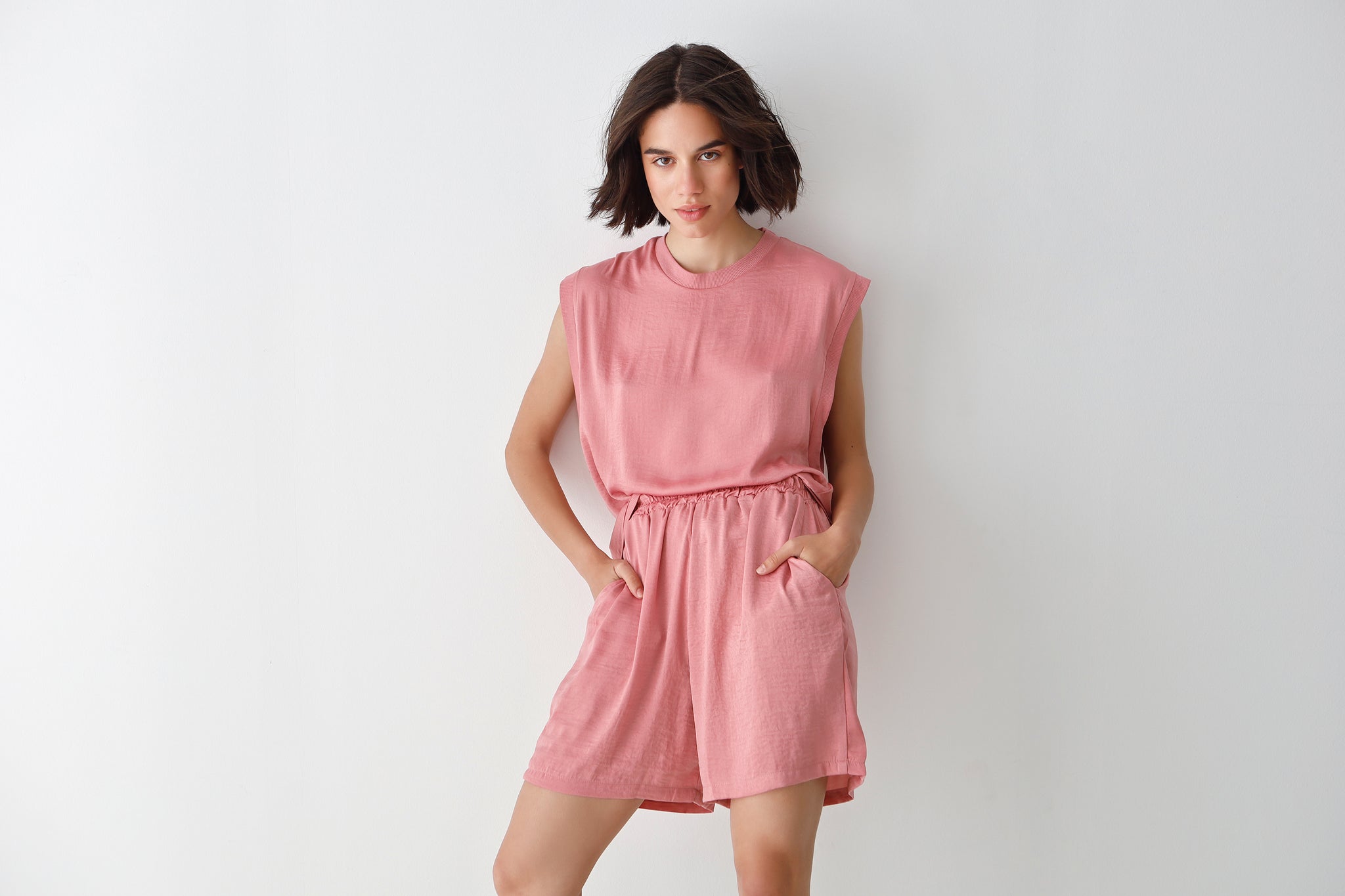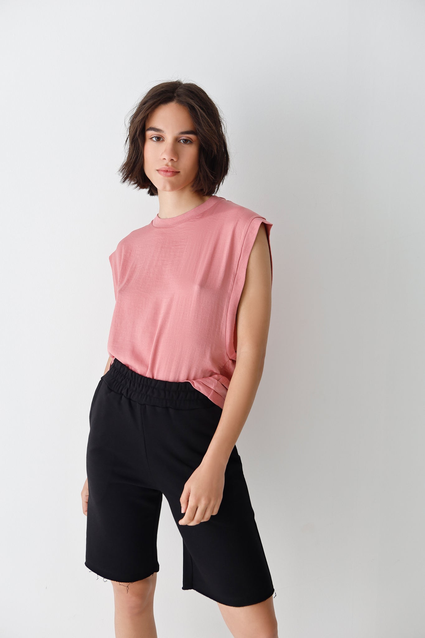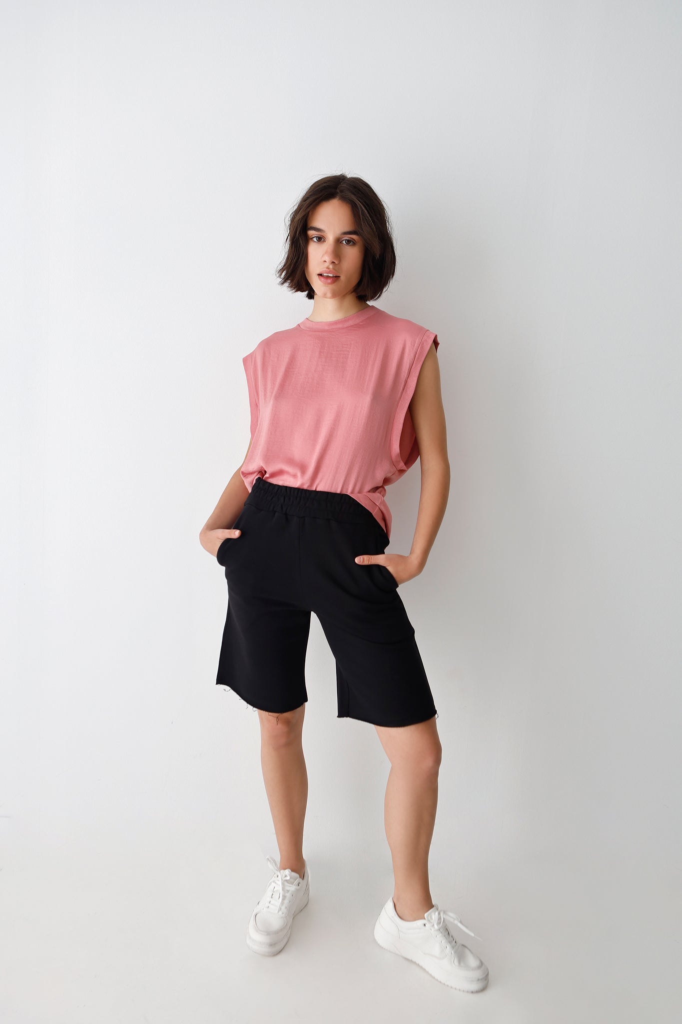 Satin t-shirt with asymmetrical length, wide straps, open armpits and ribbed trims. Loose and comfortable fit!