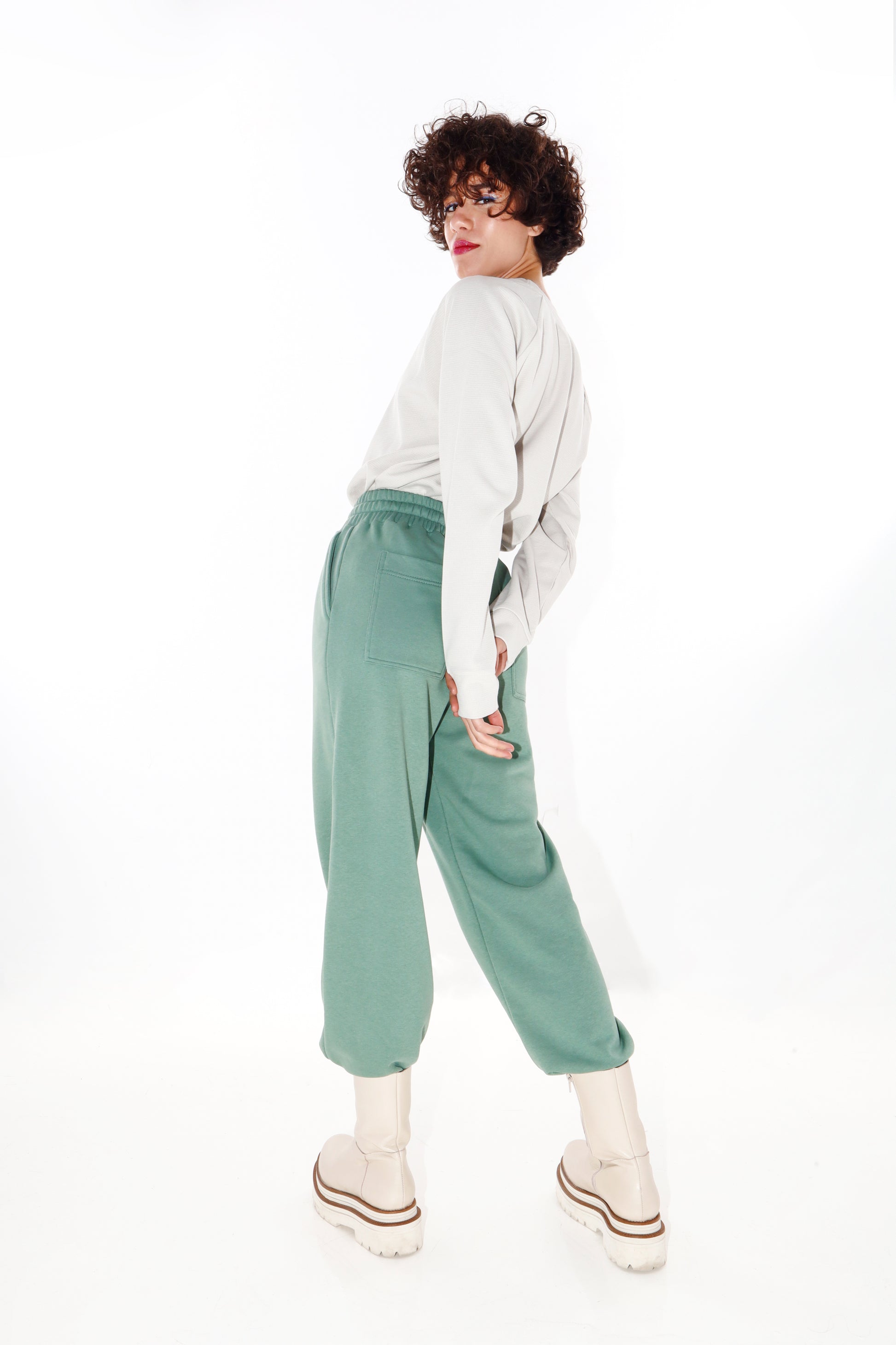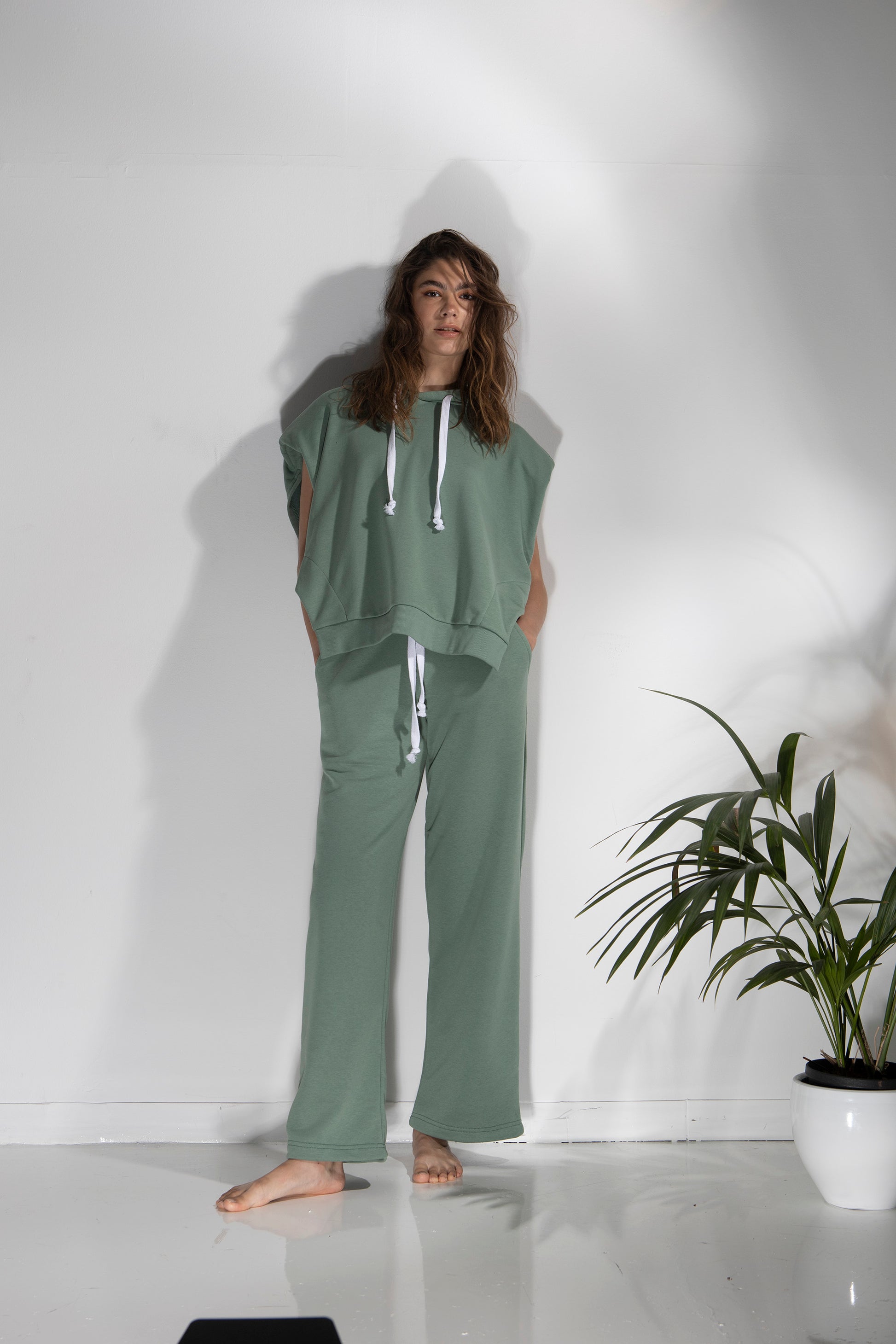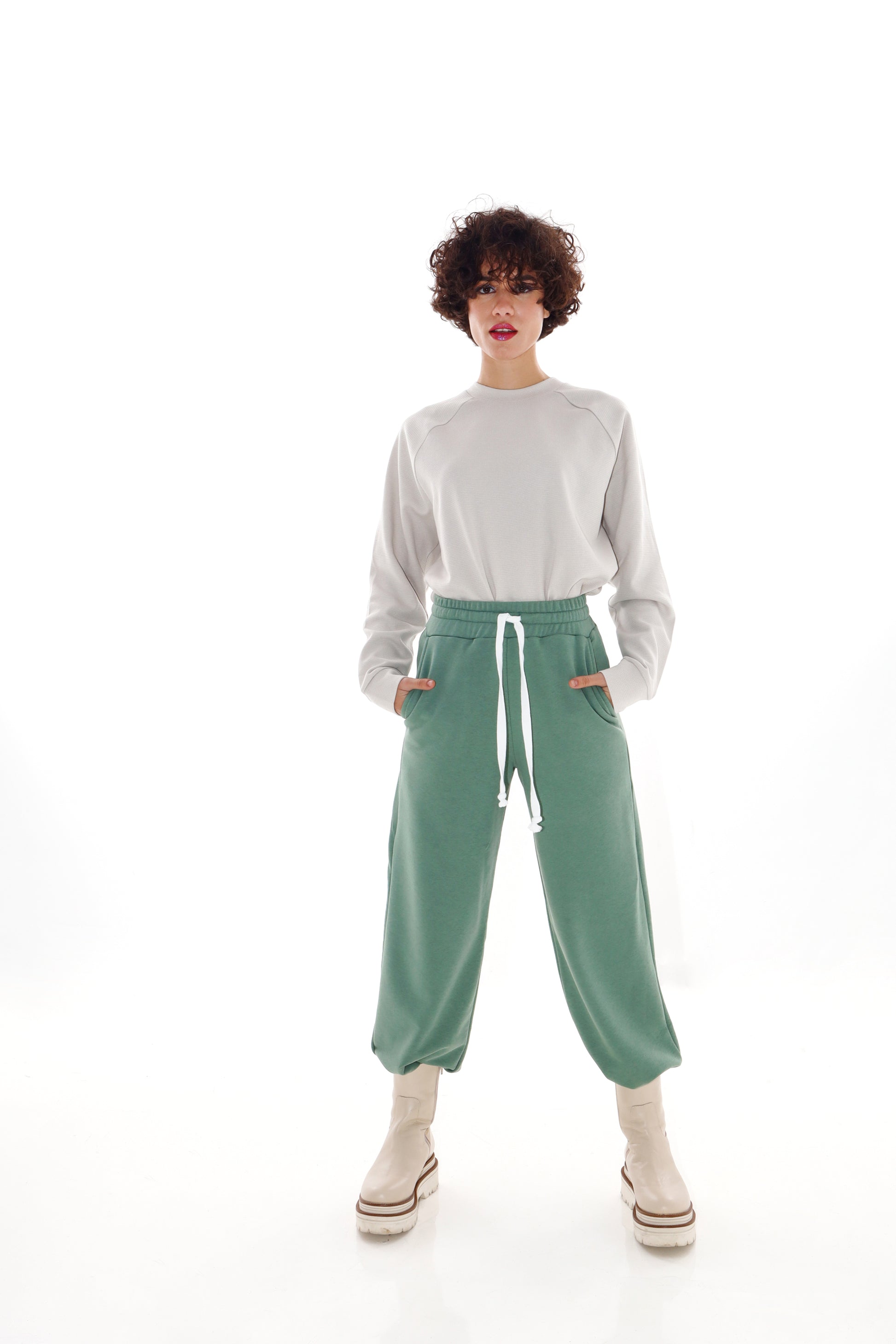 Drawstring soft sweatpants in a straight fit, with side and back pockets. It can be worn both as a high-waist and low-waist sweatpants.
